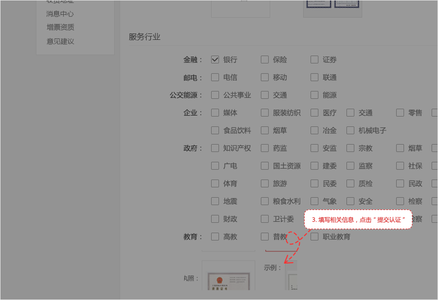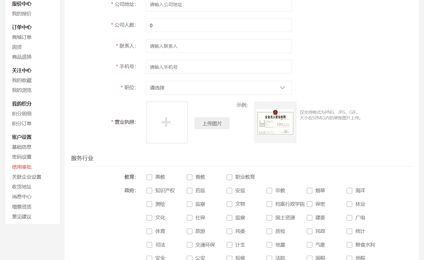 3. 填写企业的信用审批信息,选择服务行业后,点击“提交认证”