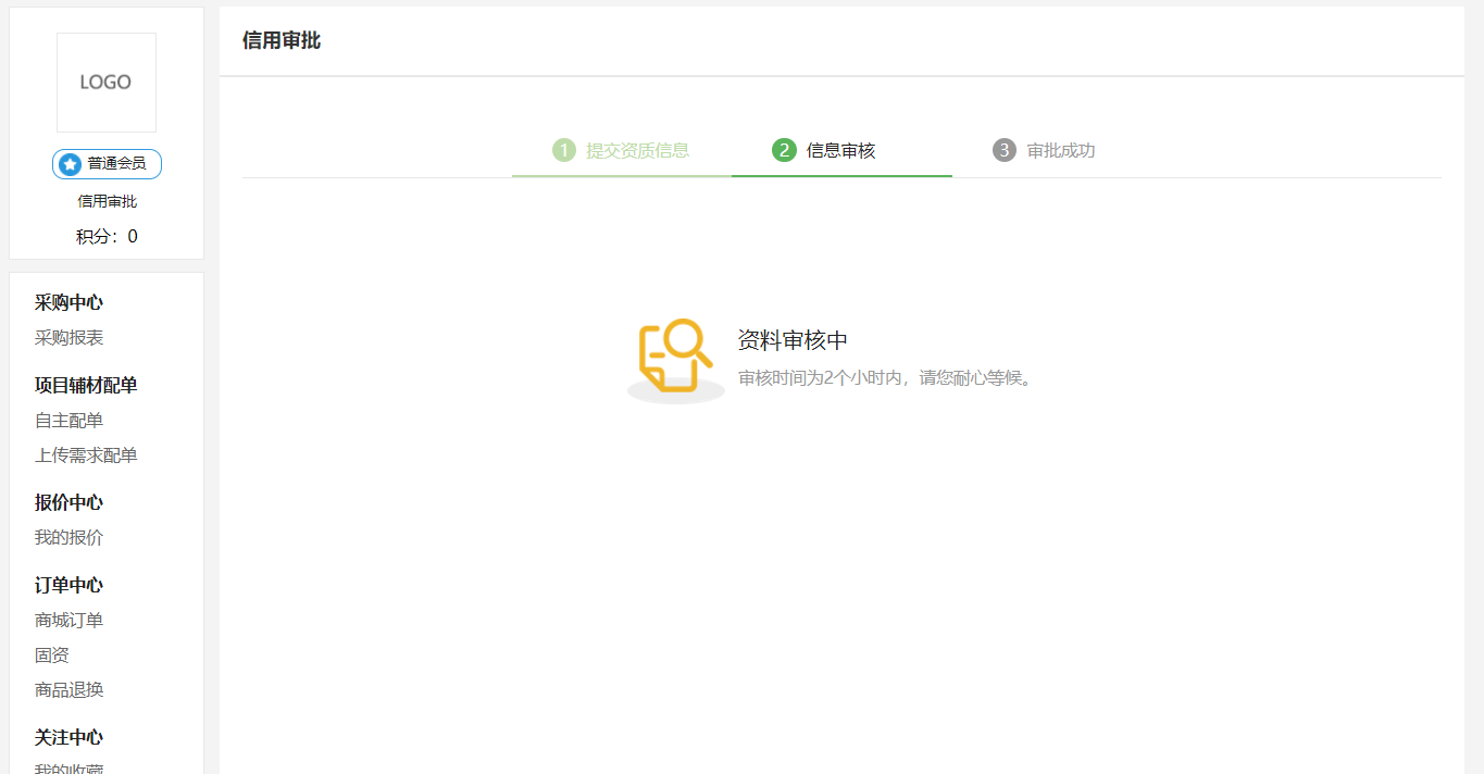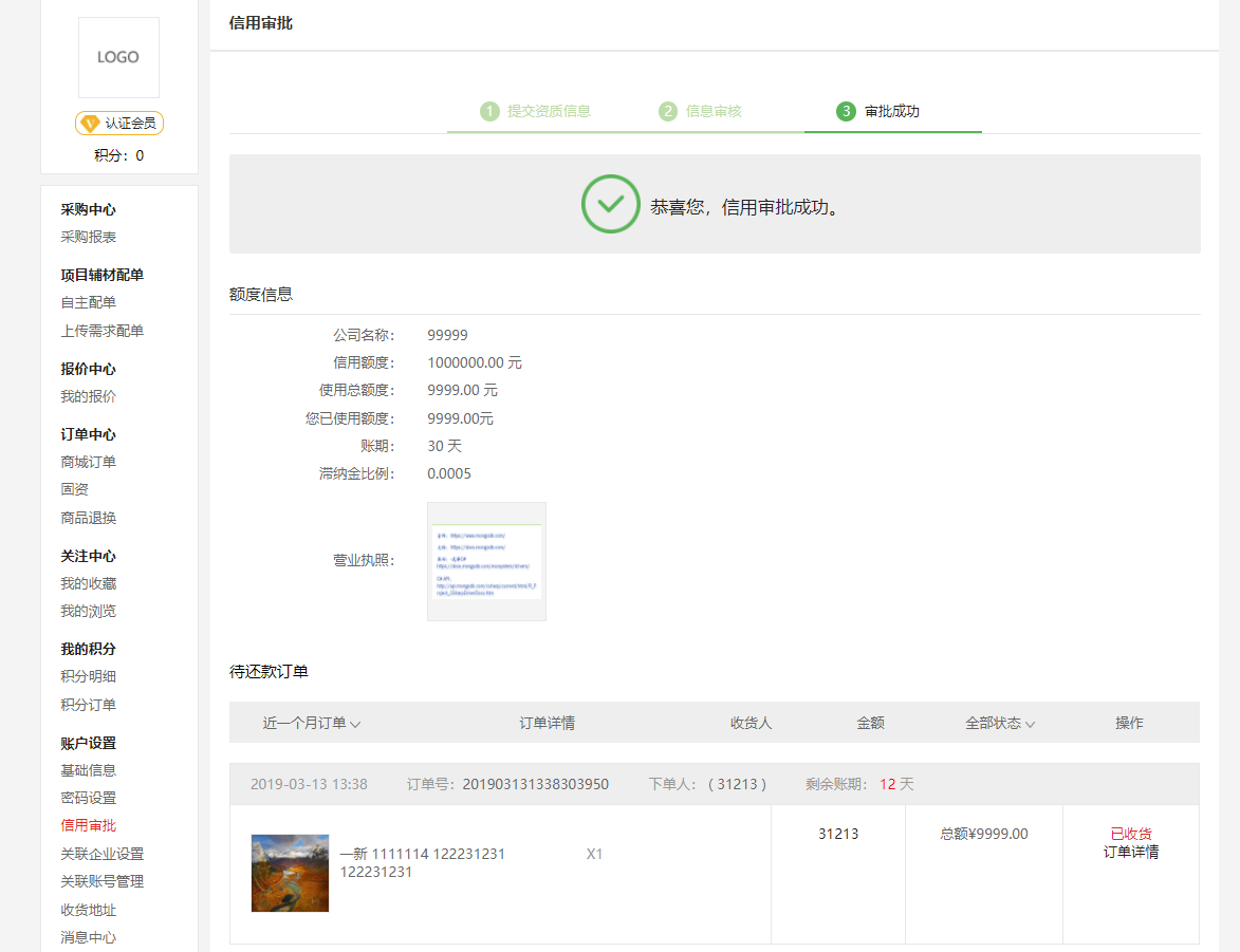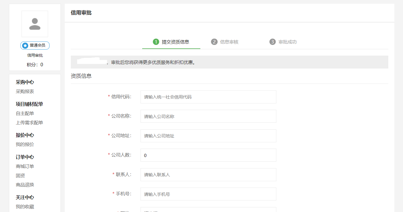 2. 点击会员头像下方“信用审批”按钮,进入企业认证页面。或点击“信用审批”进入信用审批页面。