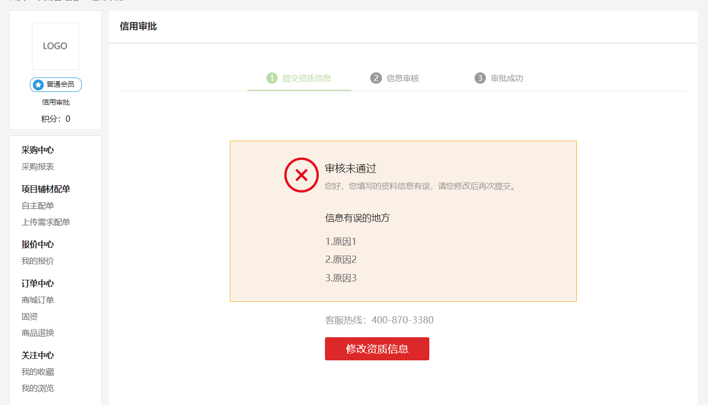 5.若审核不通过,请点击“修改资质信息”,进入修改信息页,修改过后再次提交