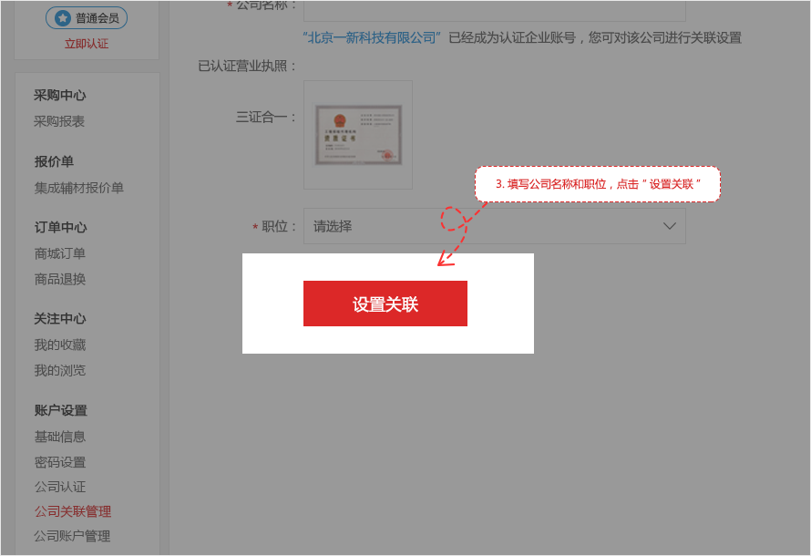 3.填写公司名称和职位,核实无误后点击“设置关联”即可关联该公司。