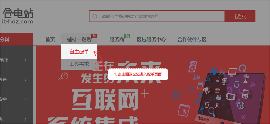 1.鼠标悬停在“辅材一键购”,点击“自主配单”进入到自主配单页面。