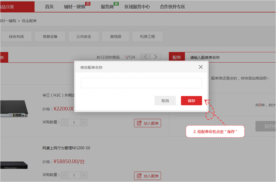 2.点击请输入配单名称显示修改配单名称弹窗,输入配单名称并点击保存。