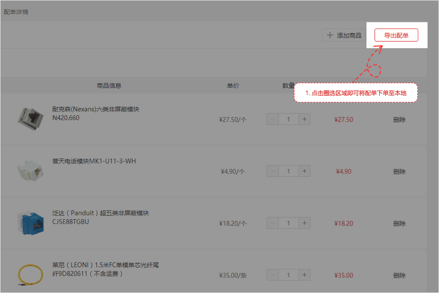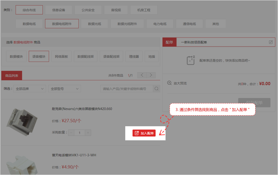 3.通过类别筛选或搜索找到所需商品, 选择数量后,点击“加入配单”